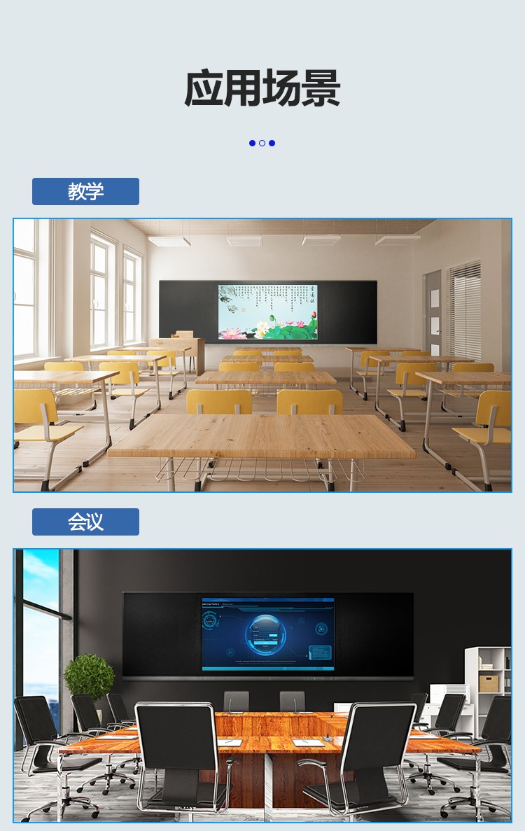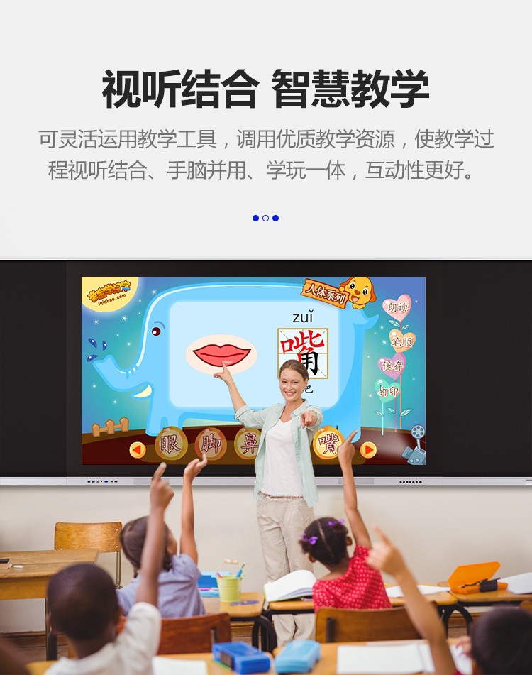 集多功能于一體 集納米黑板、電容液晶觸摸屏、音響、電腦、投影儀等眾多功能于一體;視聽(tīng)結(jié)合智慧教學(xué)可靈活運(yùn)用教學(xué)工具,調(diào)用優(yōu)質(zhì)教學(xué)資源,使教學(xué)過(guò)程視聽(tīng)結(jié)合、手腦并用、學(xué)玩一體,互動(dòng)性更好;4K超清顯示眼界大開(kāi)3840*2160超清4K分辨率,畫(huà)質(zhì)清晰絢麗。178°寬廣視角,帶來(lái)沉浸般的震撼體驗(yàn),每個(gè)角度學(xué)生清晰易讀。