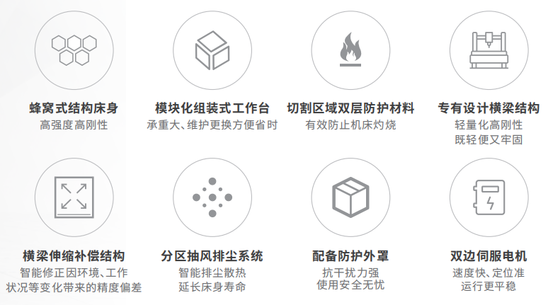 4. 具備掃碼導(dǎo)圖、圖形自動(dòng)優(yōu)化、高速尋邊、自動(dòng)調(diào)焦、測(cè)焦、閃電穿孔、穿孔除渣、蛙跳切割、飛行切割、空移避讓、氣體沖刷、起刀收刀工藝、斷點(diǎn)續(xù)切、氣壓閉環(huán)、吹氣保護(hù)、高速尋邊、振動(dòng)抑制自適應(yīng)等功能,還可根據(jù)需求配備視覺(jué)余料再生產(chǎn)、自動(dòng)更換噴嘴、平面坡口等高階功能。