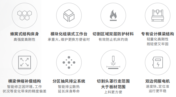 4. 具備掃碼導(dǎo)圖、圖形自動優(yōu)化 、高速尋邊、自動調(diào)焦、測焦、閃電穿孔、穿孔除渣、蛙跳切割、飛行切割、空移避讓、氣體沖刷、起刀收刀工藝、斷點續(xù)切、氣壓閉環(huán)、吹氣保護、高速尋邊、振動抑制自適應(yīng)等功能,還可根據(jù)需求配備視覺余料再生產(chǎn)、自動更換噴嘴、平面坡口等高階功能。