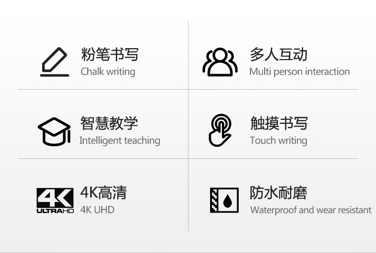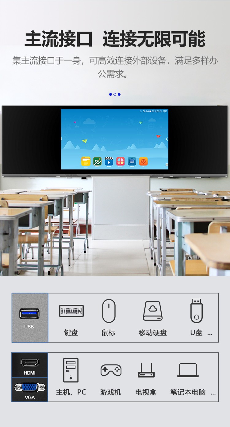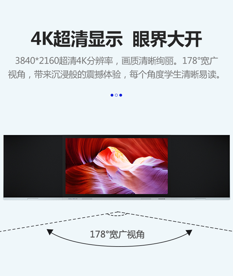 集多功能于一體 集納米黑板、電容液晶觸摸屏、音響、電腦、投影儀等眾多功能于一體;視聽(tīng)結(jié)合智慧教學(xué)可靈活運(yùn)用教學(xué)工具,調(diào)用優(yōu)質(zhì)教學(xué)資源,使教學(xué)過(guò)程視聽(tīng)結(jié)合、手腦并用、學(xué)玩一體,互動(dòng)性更好;4K超清顯示眼界大開(kāi)3840*2160超清4K分辨率,畫(huà)質(zhì)清晰絢麗。178°寬廣視角,帶來(lái)沉浸般的震撼體驗(yàn),每個(gè)角度學(xué)生清晰易讀。