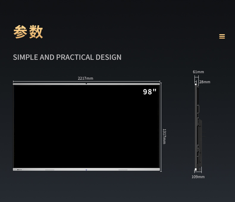 | 顯示面積 | 98英寸(2161.4*1202.2) | 亮度 | 98英寸=450cd/m2 |