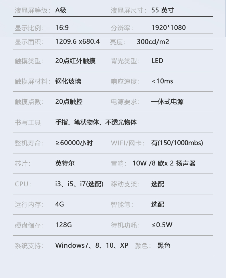 | 觸摸屏材料 | 鋼化玻璃 | 響應(yīng)速度 | ≤1ms(兩點(diǎn)觸摸) |