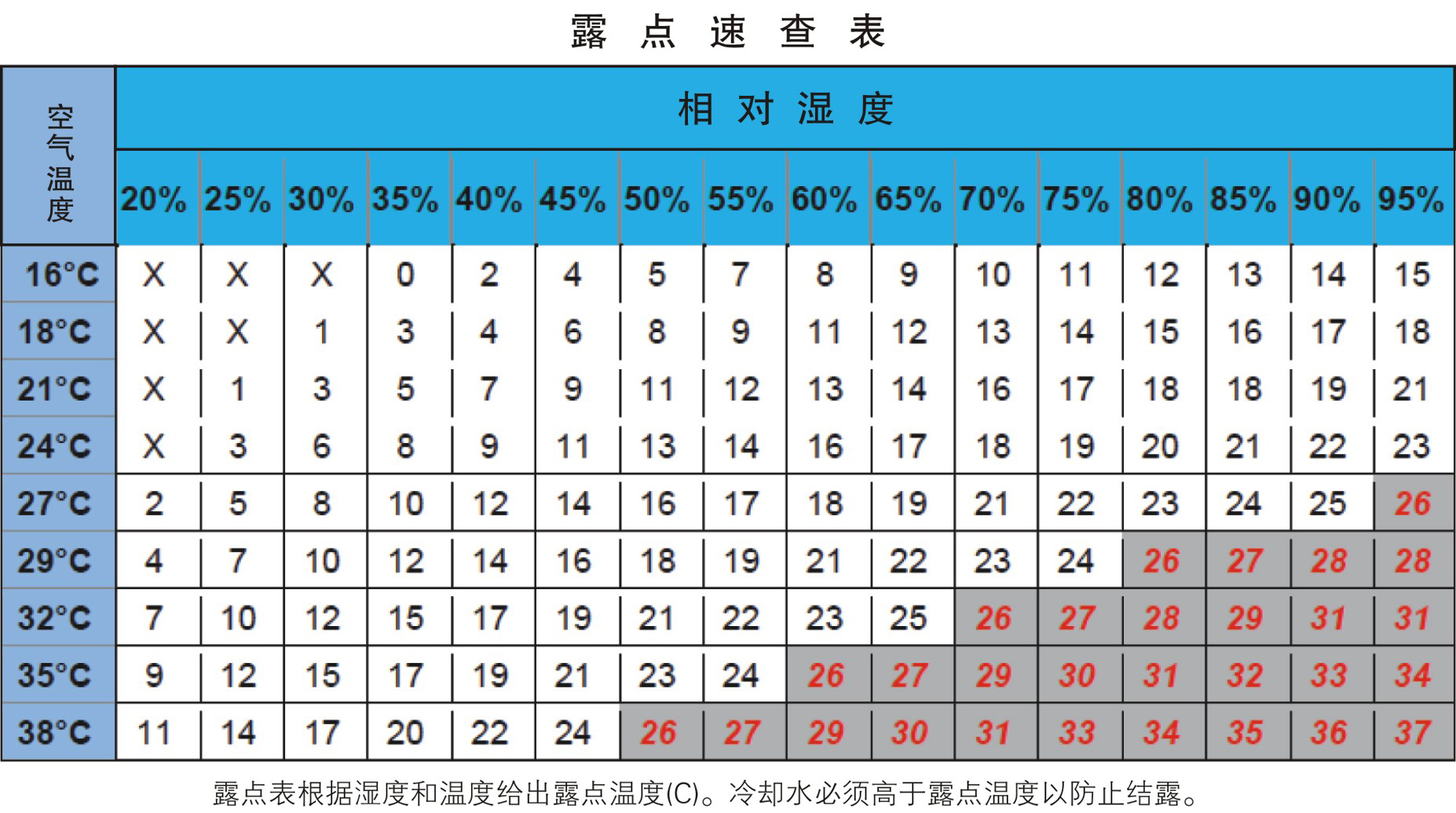 冷卻水水溫對電光轉(zhuǎn)換效率,穩(wěn)定性及結(jié)露有著直接的影響。通常情況下,冷卻水水溫設(shè)定如下: